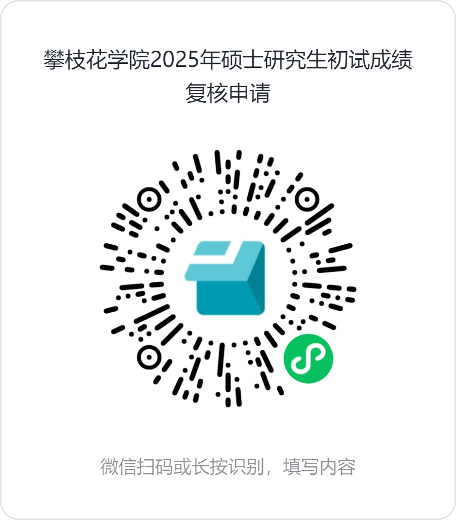 微信扫描下方二维码,如实填写“攀枝花学院2025年硕士研究生初试成绩复核申请”,仔细阅读填写说明,并按要求完整填报成绩复核申请表单。(请勿多次重复提交)